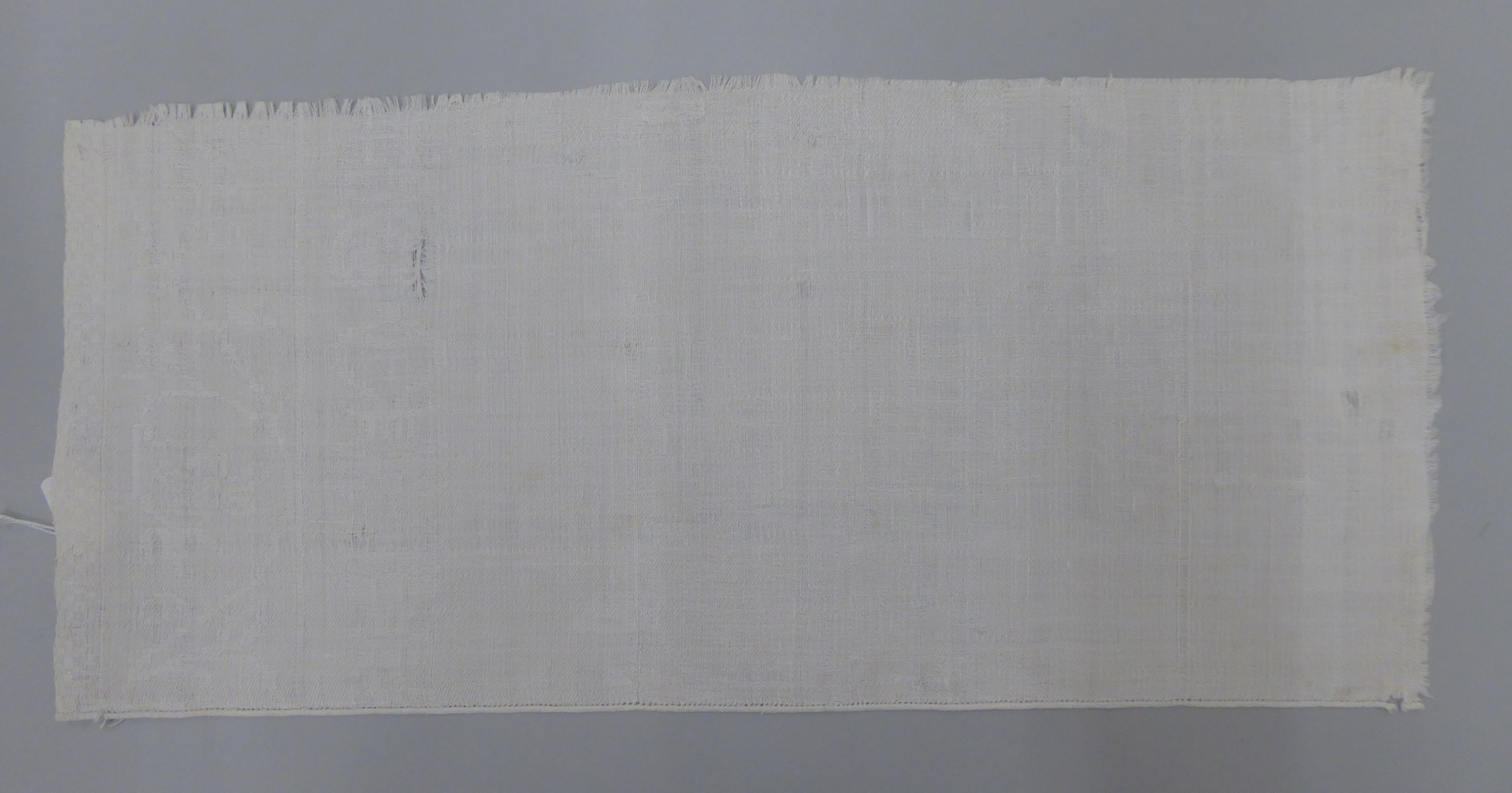Linnendamast met schaakbordrand, meanders en bloemen en wapen van Utrecht en de onderzijde van de wapens van 'Frise' en 'Malines'