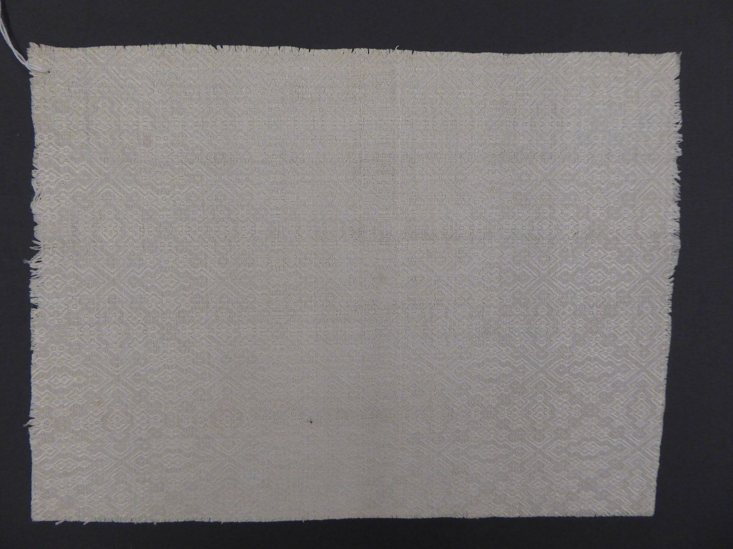 Fragment witte damast in tegelpatroon geweven, pavie, ook wel 'het grote pavijtje' genoemd