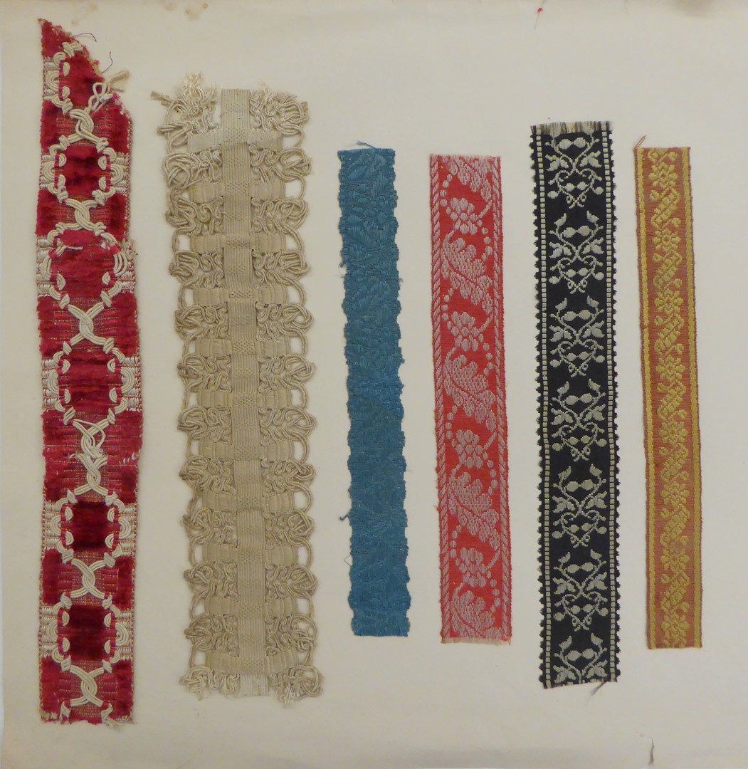 Helft van vel karton (in tweeën gescheurd) met totaal 14 fragmenten garnituren