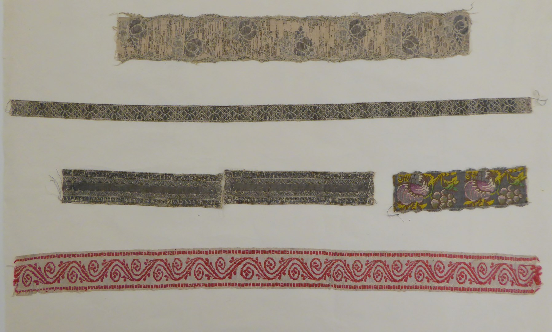 Vel papier met vijf fragmenten van garnituren