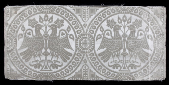Witte damast met cirkels waarin bloeiende tak tussen geaffronteerde vogels, keperbinding