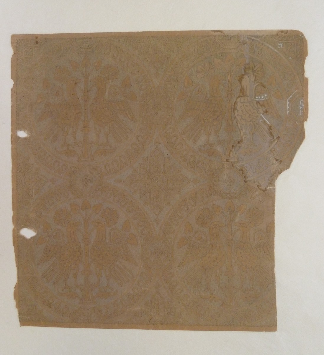 Aquarel naar weefsel van ABM t2342, vier cirkels waarin bloeiende tak tussen geaffronteerde vogels