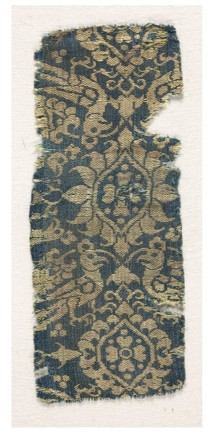Blauw weefsel met gele inslag: lotuspalmetten waartussen plant met geaffronteerde papegaaien