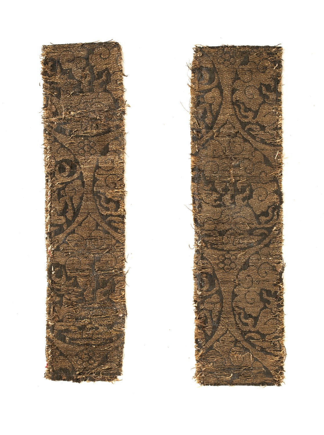 Donkerblauw weefsel met lotuspalmetten waarin hsi-niu (Chinese neushoorn) onder gestileerde wolk