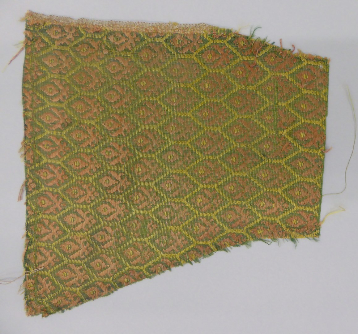 Op een grond van olijfgroene ripszijde is met gele zijde een ruitpatroon bestaande uit zeshoeken ingeweven. In de zeshoeken kleine gestyleerde bloemen met gele hartjes. De inslagdraden zijn in geel en rood (dikke draden) en groen (dunne draden). De grond (ketting) laat een variatie zien op de platbinding, waardoor een ripseffect ontstaat. Het motief wordt ...