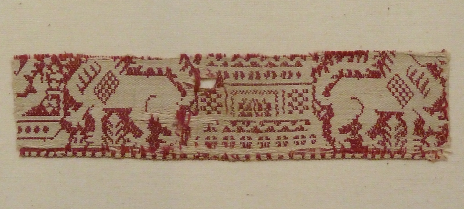 Het weefselfragment is van halfzijde (linnen/zijde). De witte linnen kettingdraden vormen het patroon en de rode zijden inslagdraden de grond. In het patroon zijn stappende leeuwen en gestyleerde boompjes te onderscheiden.