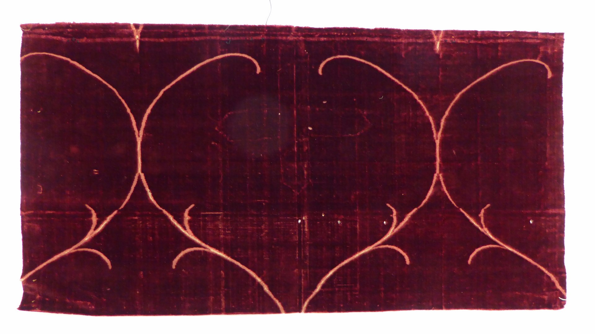 Op een fond van karmozijnrood zijdefluweel met gesneden pool tekent zich op een roze fond het motief af: een uitgespaard patroon van dunne ranken met enkele vertakkingen. Deze vormen in kettingsatijn spitsovalen. Staat: het kettingsatijn is gesleten.