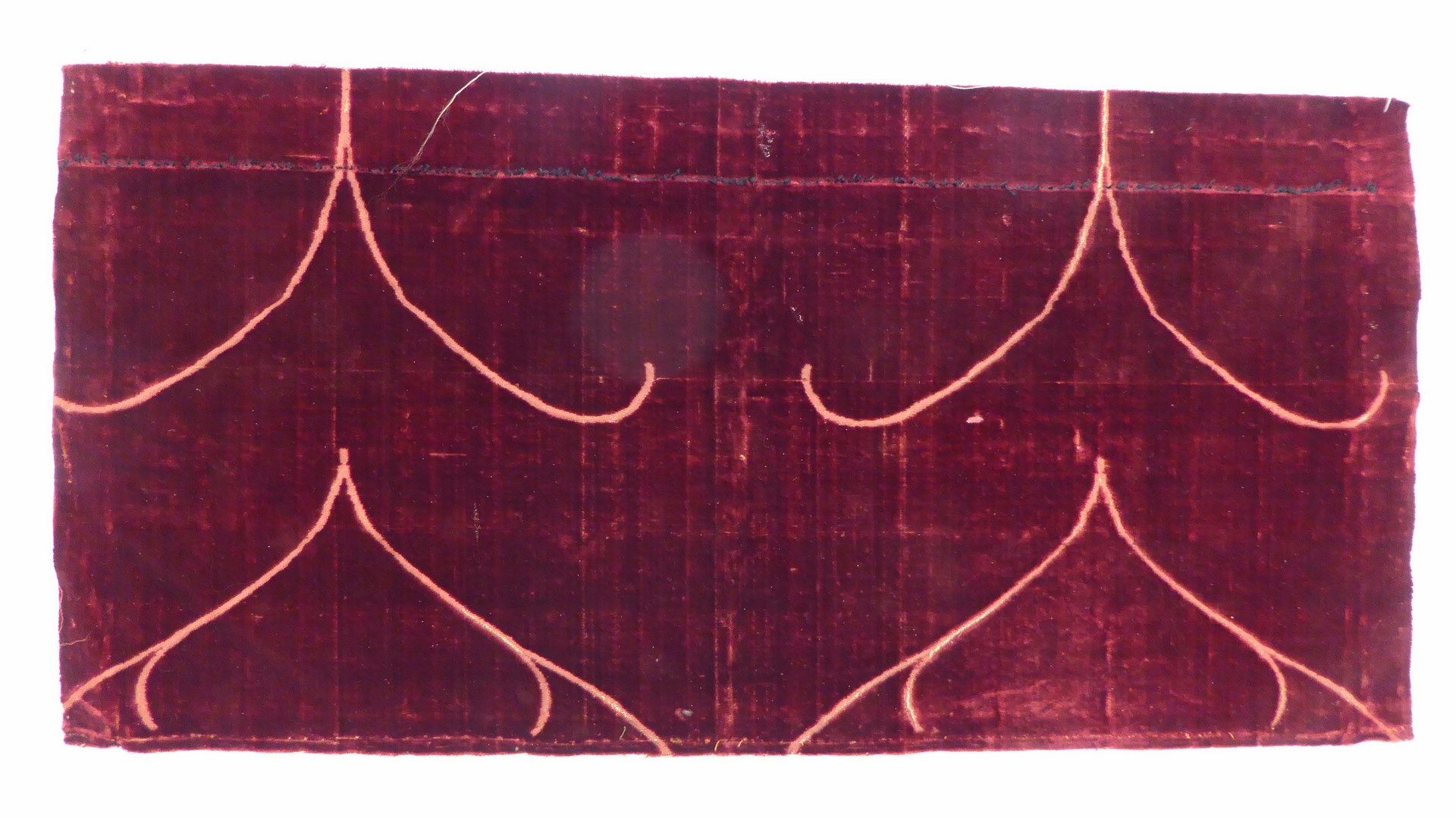 Rood gesneden fluweel met roze fond waarin ranken in spitsovaal