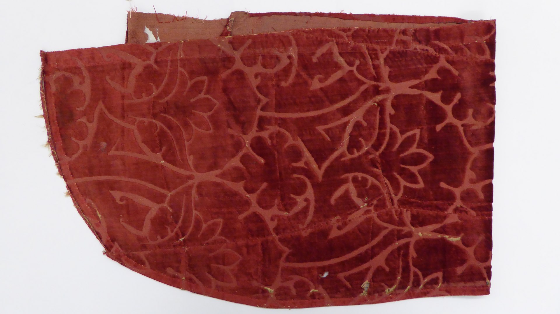 Op een fond van lichtrode zijdefluweel is met donkerder rood een druk patroon getekend van fluweel met gesneden pool. Zich buigende stammen rijzen omhoog. Uit de stammen ontspruiten links en rechts flinke granaatappels, bladeren en ranken. Het motief is in kettingsatijn.