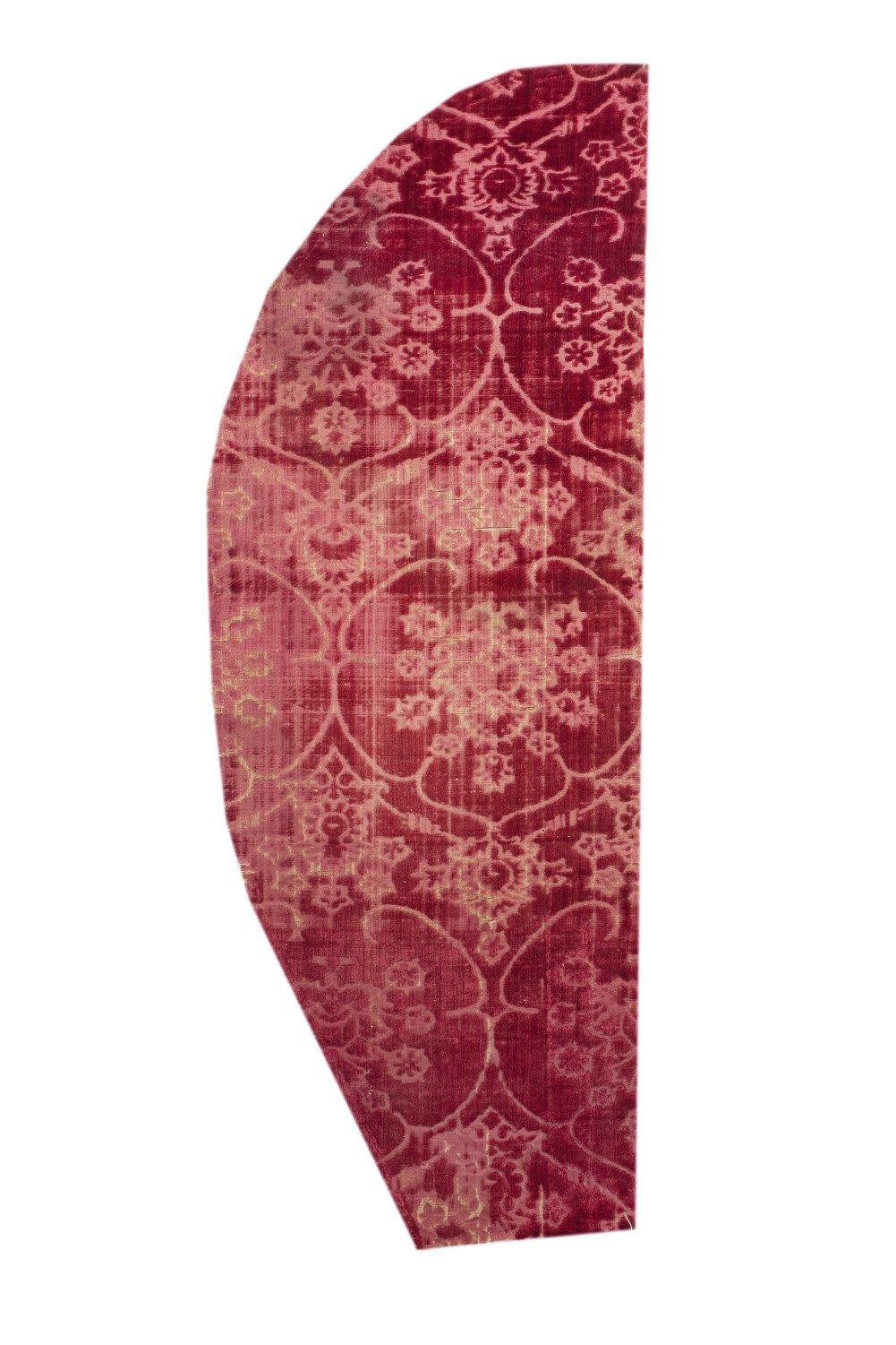 Op een karmozijnrood fond van zijdefluweel met gesneden pool is in iets lichter karmijnrood een patroon uitgespaard, bestaande uit spitsovale velden, die elkaar aanraken. Binnen de velden bloeiende rosetachtige bloemen. De ruimte tussen de rijen rosetten wordt opgevuld met kleine granaatappelbloesems.