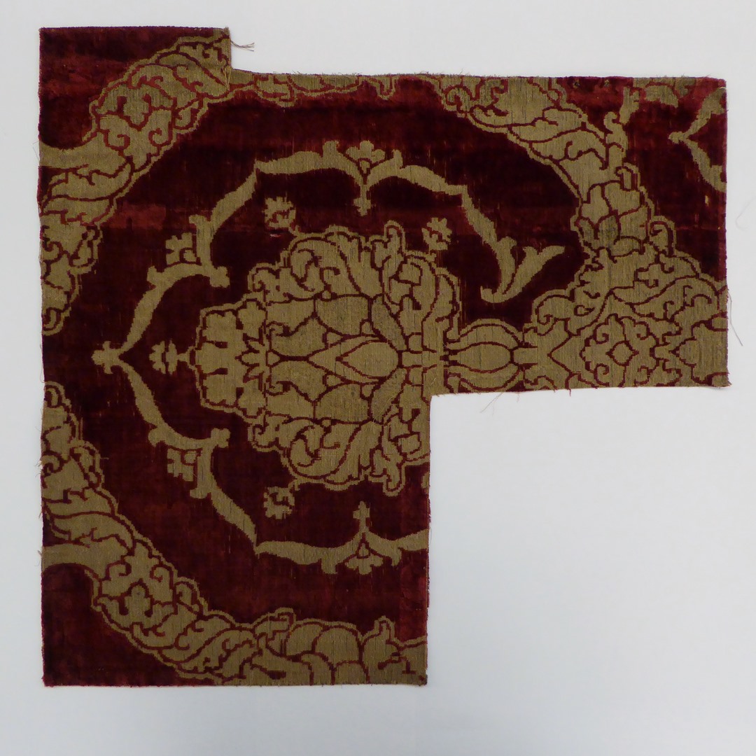 Gouden (on)gekruifd gesneden fluweelbrokaat met groot granaatappelmotief in spitsovalen