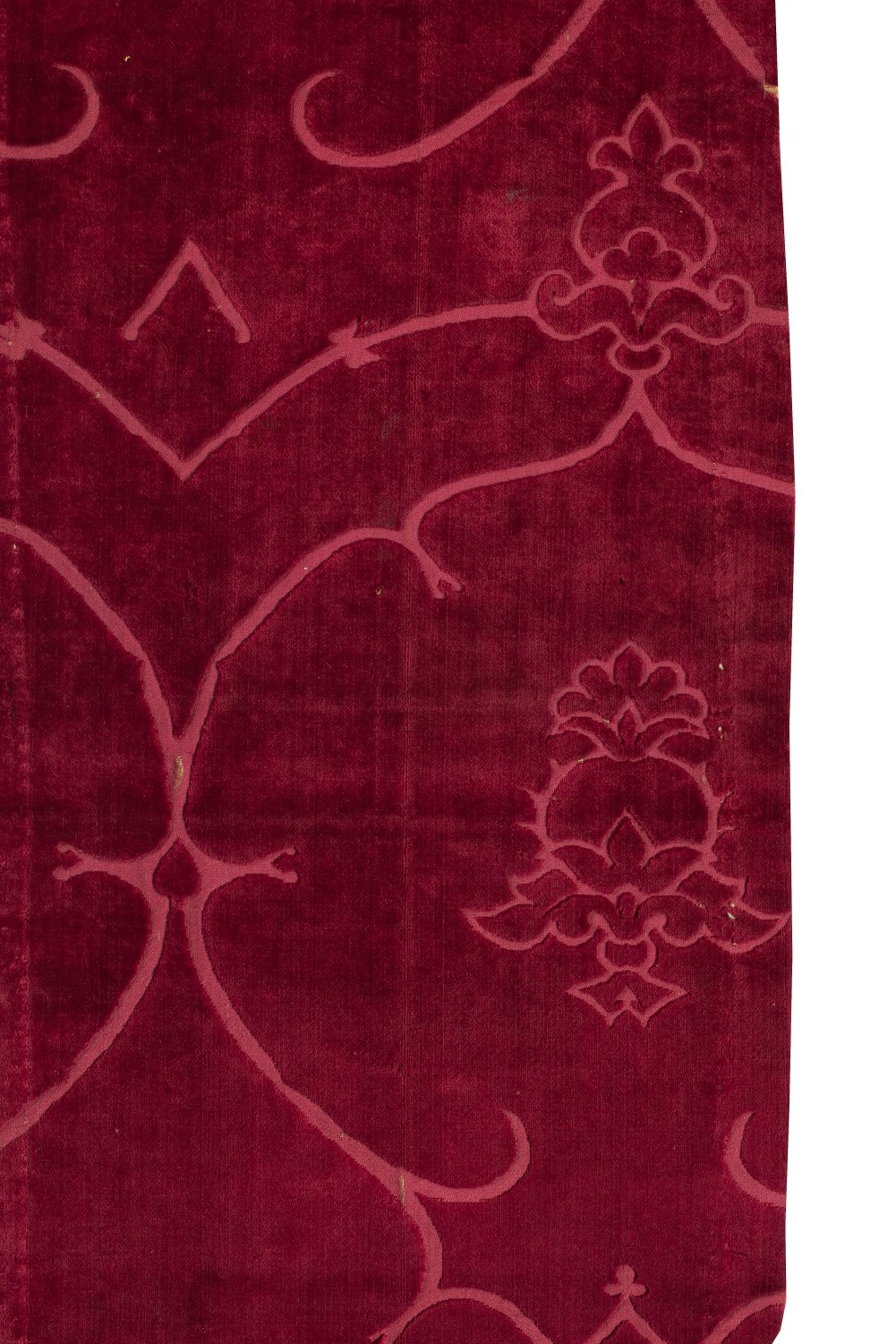 Rood fluweel met uitsparingen van ranken in spitsovaal waarin granaatappelknop