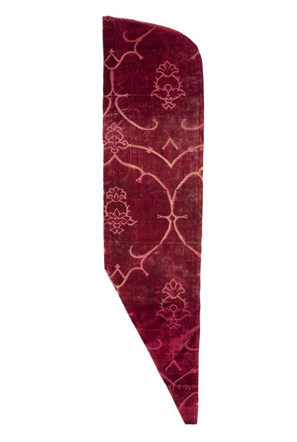 Rood fluweel met uitsparingen van ranken in spitsovaal waarin granaatappelknop