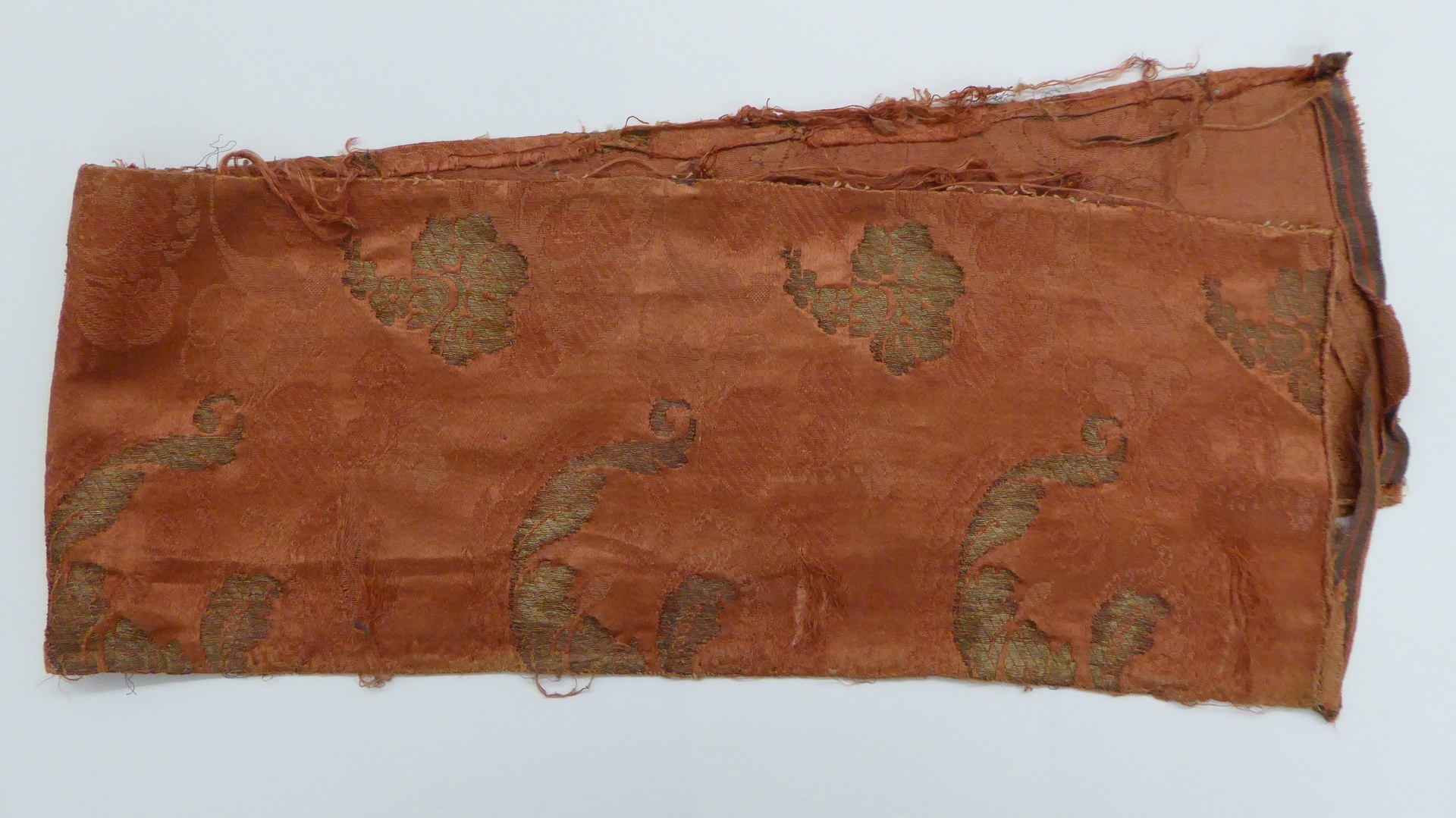 Roodbruin brochéweefsel met ingeweven gouden bloemmotief
