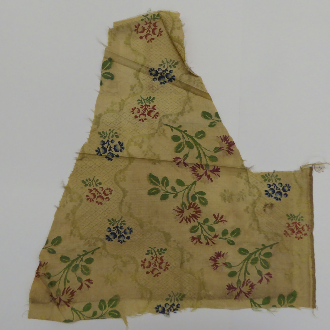 Geel zijdeweefsel met golvend kantmotief en rood-blauw boeketje