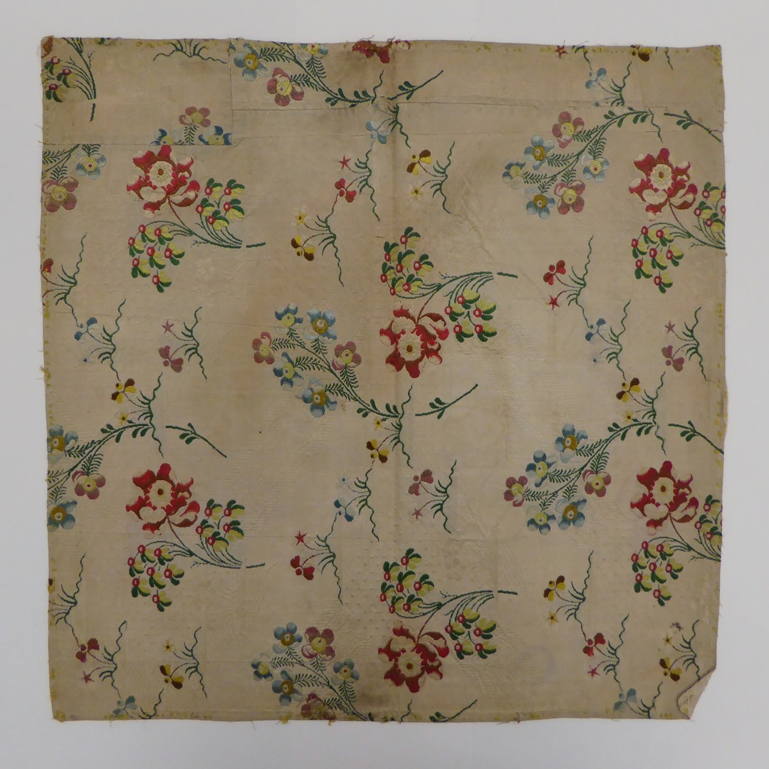 Witte ripszijde met ingeweven kantpatroon en veelkleurige bloemen