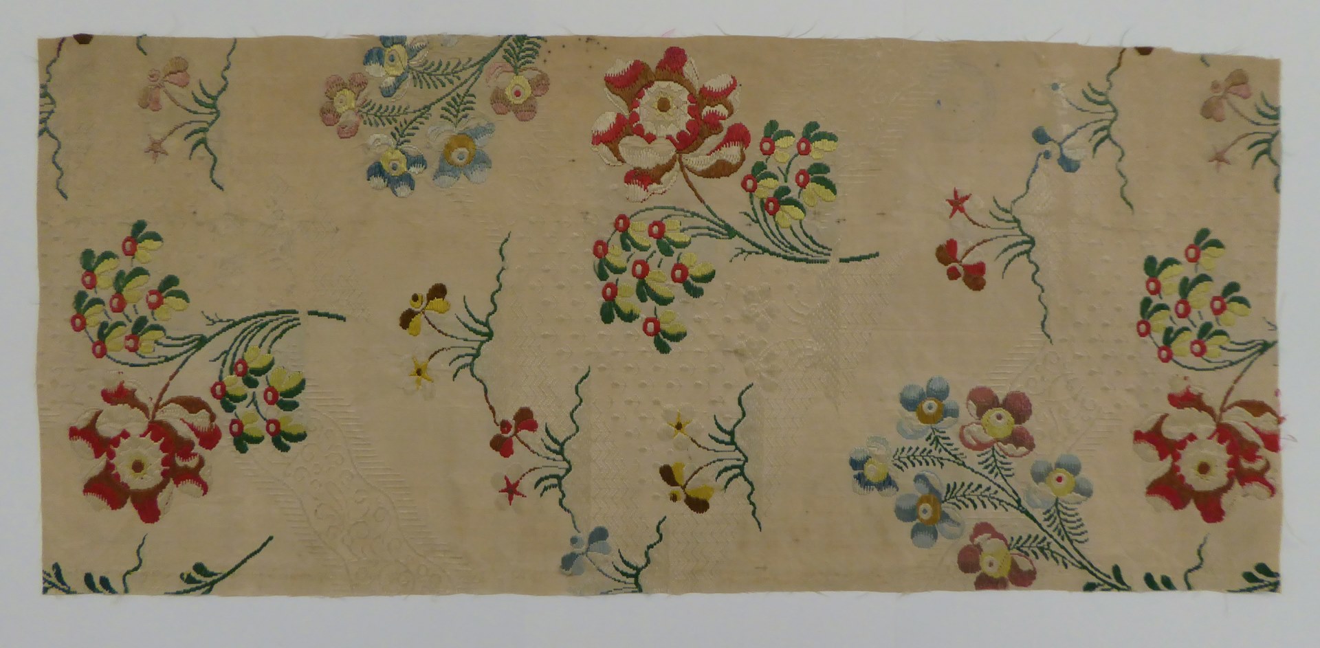 Witte ripszijde met ingeweven kantpatroon en veelkleurige bloemen