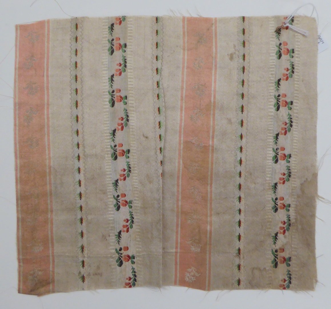 Roze-wit gestreept droguet met roze en groene bloemslingers