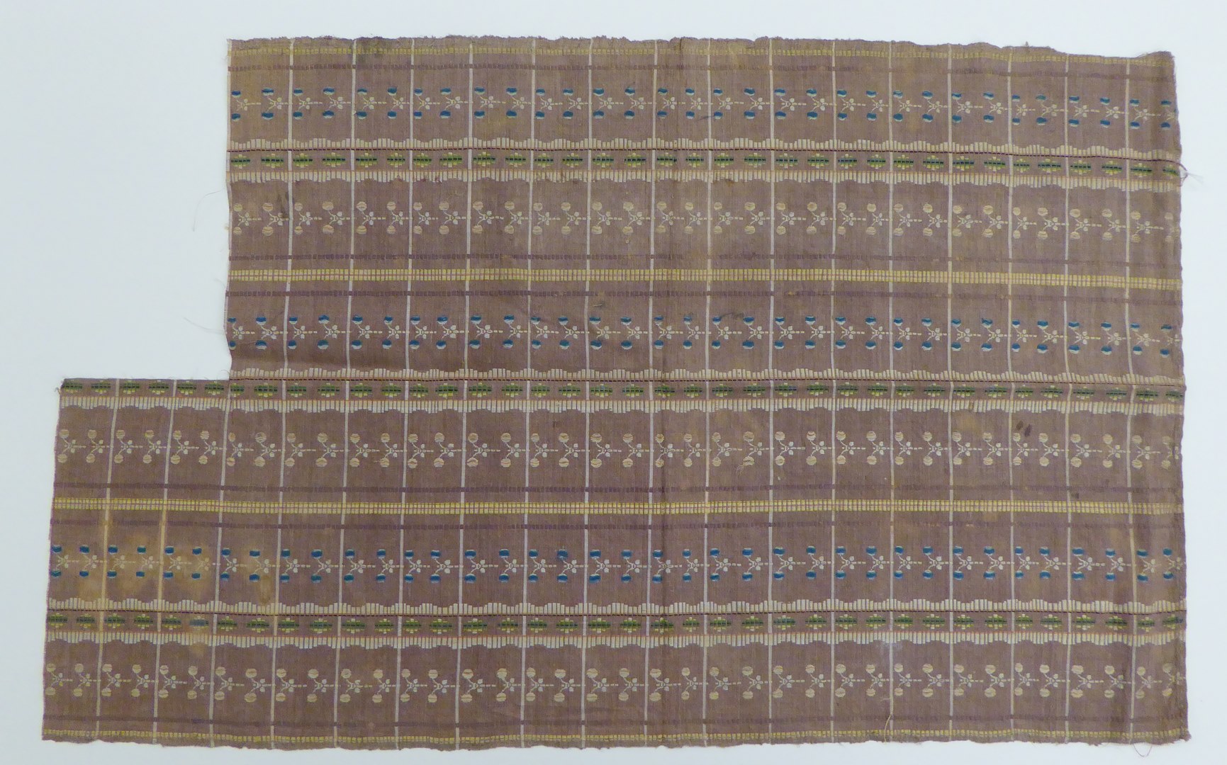 Beige halfzijde met gele-groene banden en blauw-witte takjes
