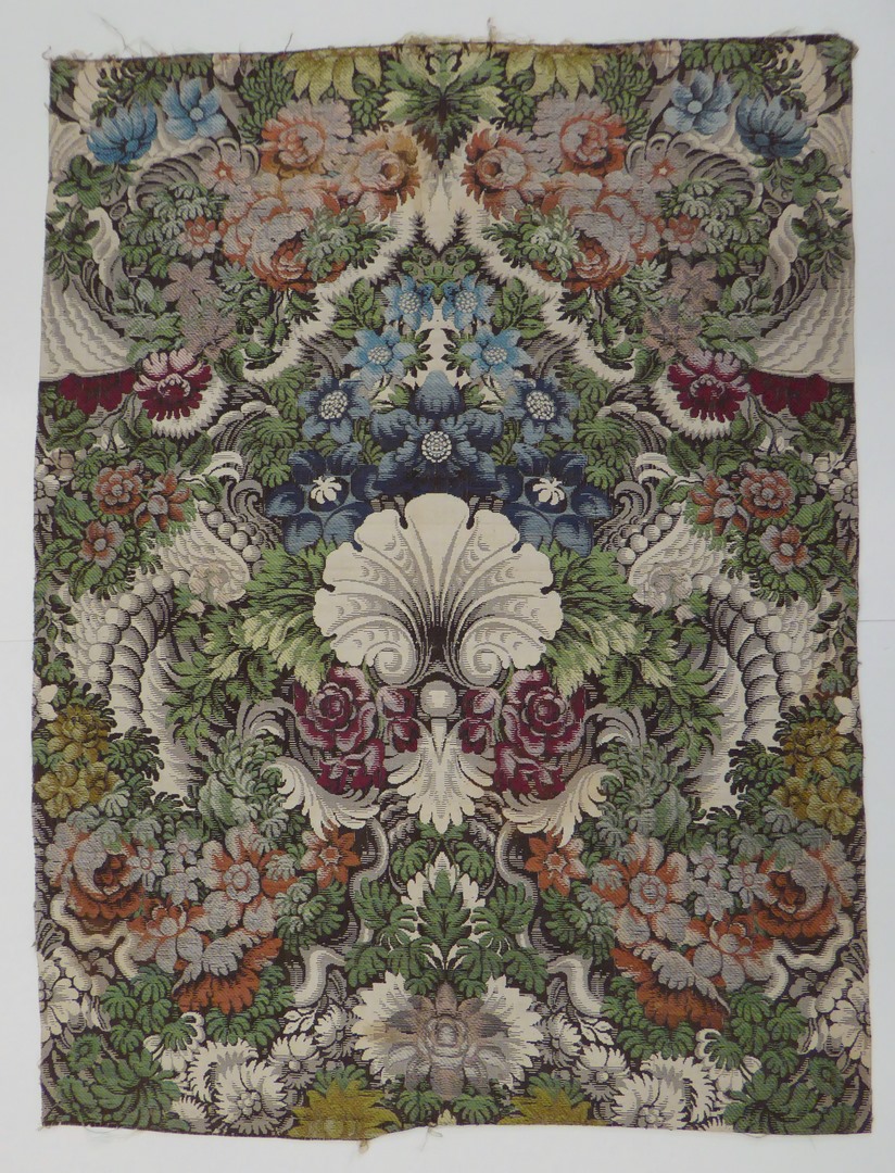 Witte lampas met veelkleurige chrysanten, margrieten enz.