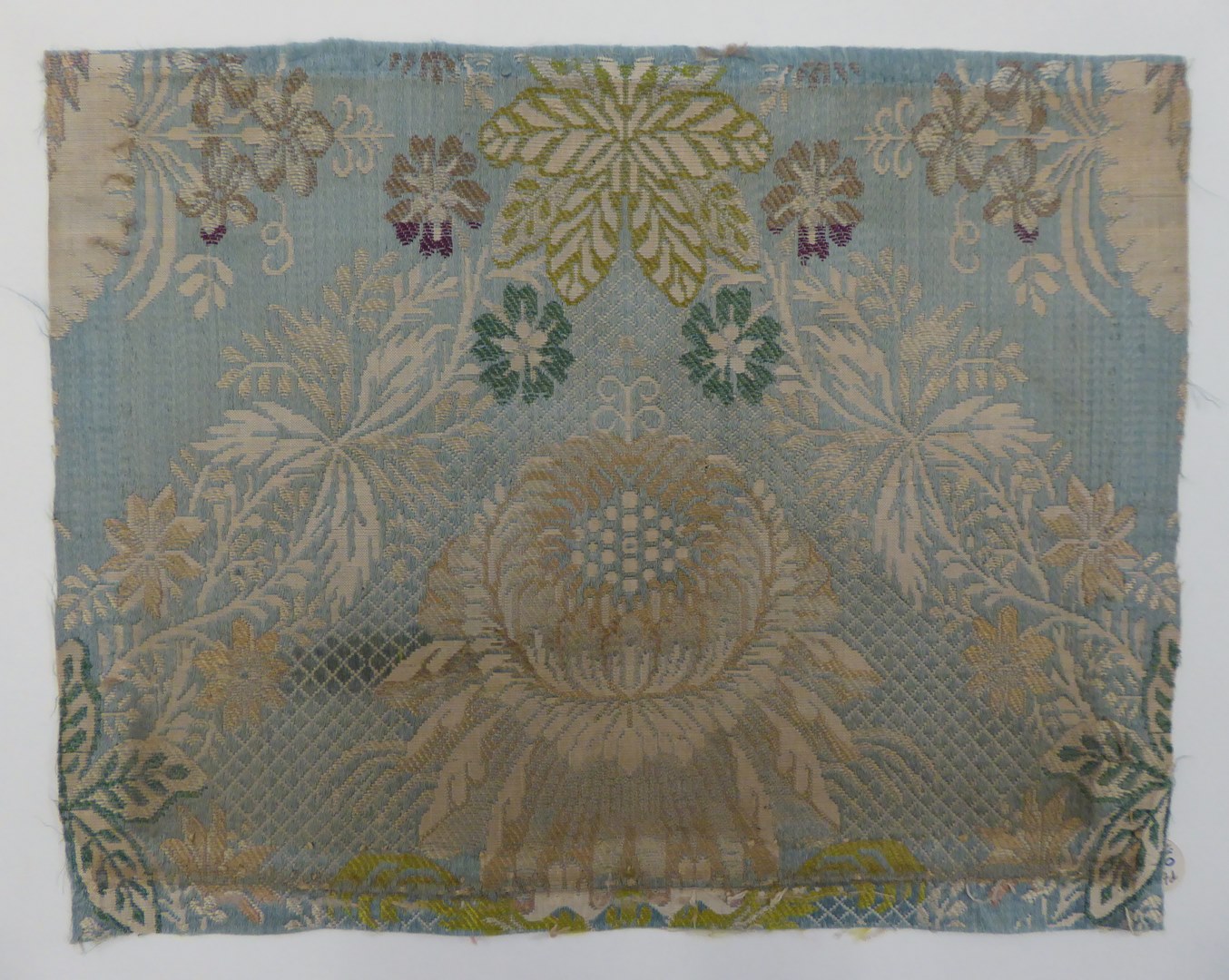 Blauwe lampas met wit-gele en groene takken en bloemmotieven