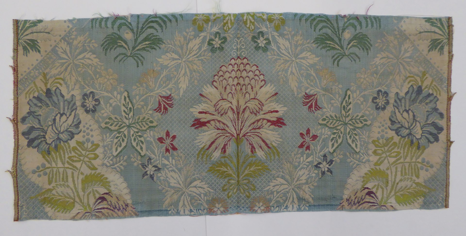 Blauwe lampas met wit-gele en groene takken en bloemmotieven