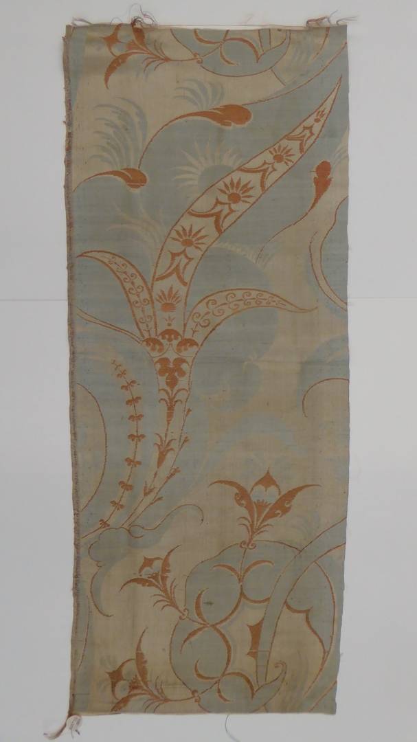 Blauwe lampas met wit-rood stengelpatroon à la William Morris