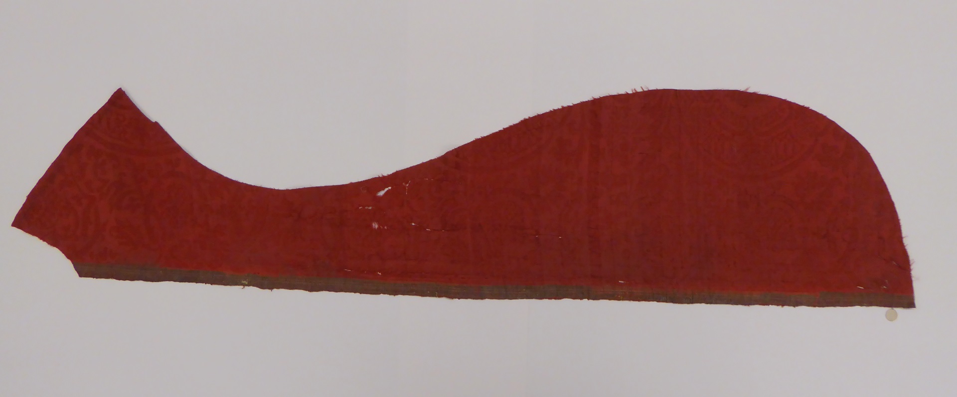Rode zijdedamast met granaatappelpatroon met arabesken, helft voorzijde kazuifel
