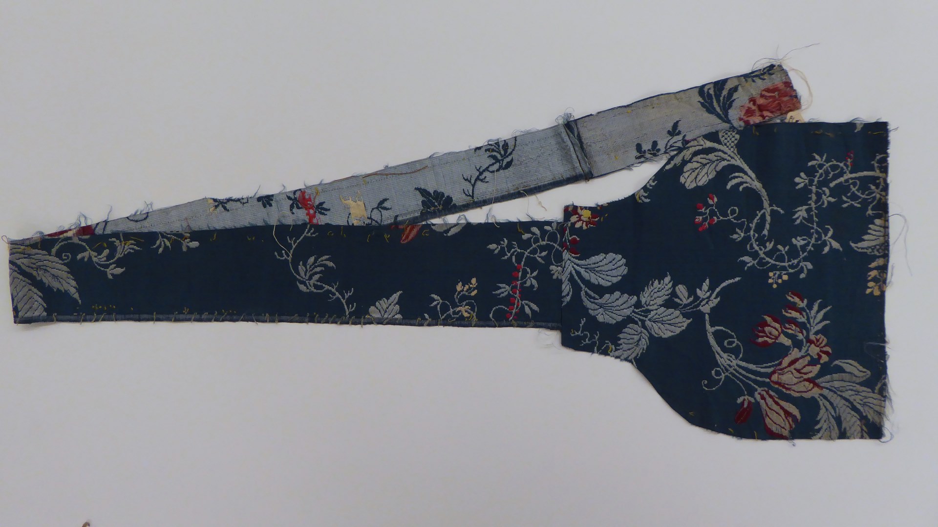 Blauwe lampas met bloemmotieven, 3 aan elkaar genaaide fragmenten, fragmenten van stola
