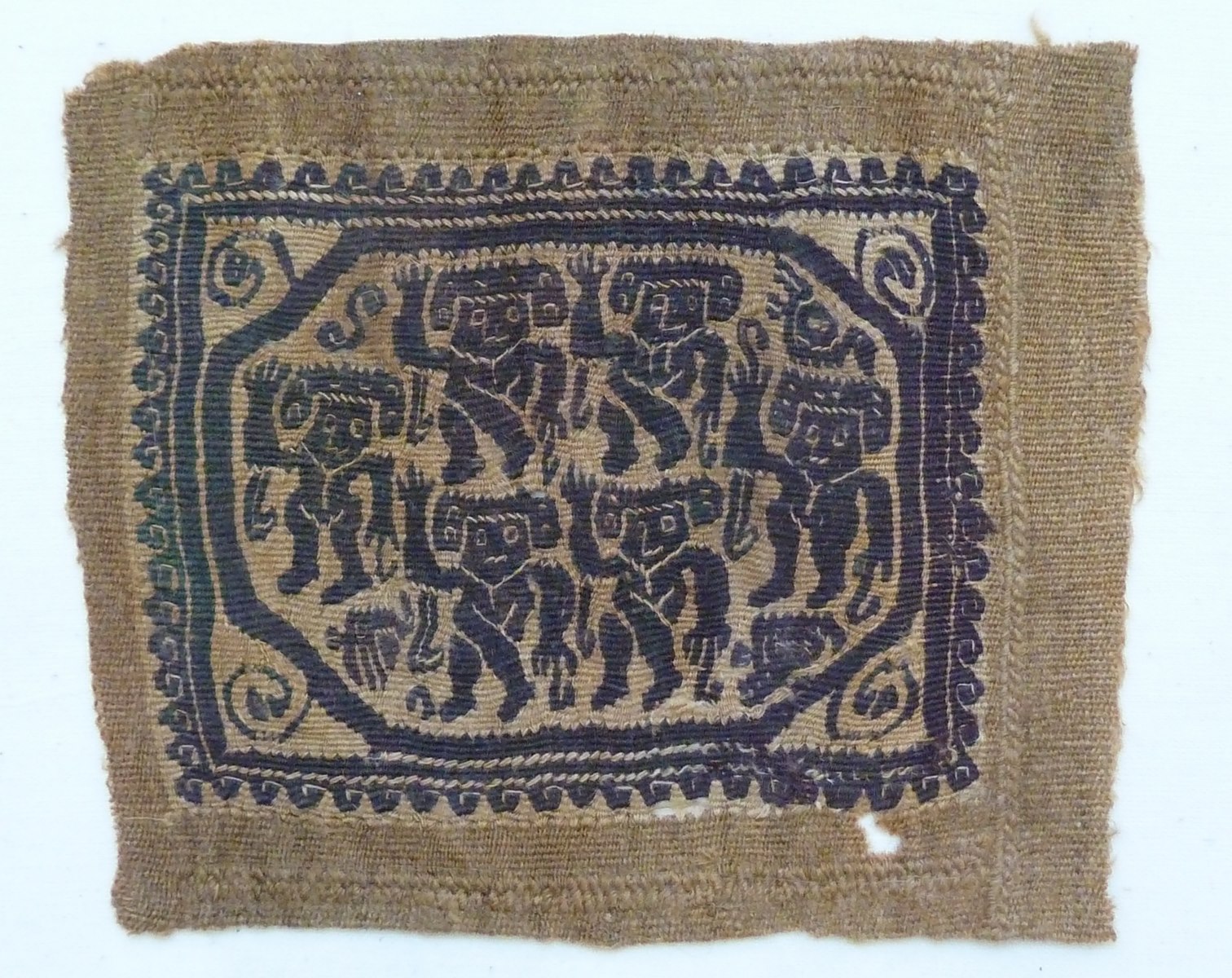 Het rechthoekige fragment heeft mogelijk gediend als versiering van een Koptisch kledingstuk, of maakte deel uit van een kussen. Met purperen draden zijn op een naturel ondergrond binnen een zeshoek zes figuurtjes ingeweven. Ze houden één arm opgeheven; de middelste vier figuren houden de benen gekruist, de andere twee houden de benen naast elkaar. Tussen ...