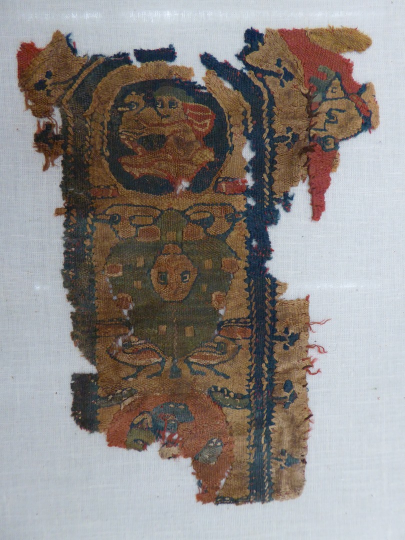 Koptisch weefsel met drie medaillons in blauw, groen, rood met putto en kop