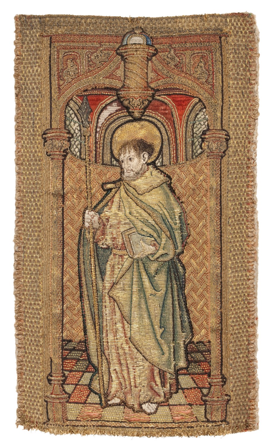 Op het borduurwerk wordt in eenzelfde architecturale ambiance als ABM t2107a de apostel Matthias afgebeeld staande op een tegelvloertje. Hij draagt een wijd onderkleed met gordel en een ruime mantel met gouden kraag en sierrand aan de zoom. Hij houdt een boek in de linkerhand en in de rechterhand zijn attribuut, de lans. Techniek: zie ...