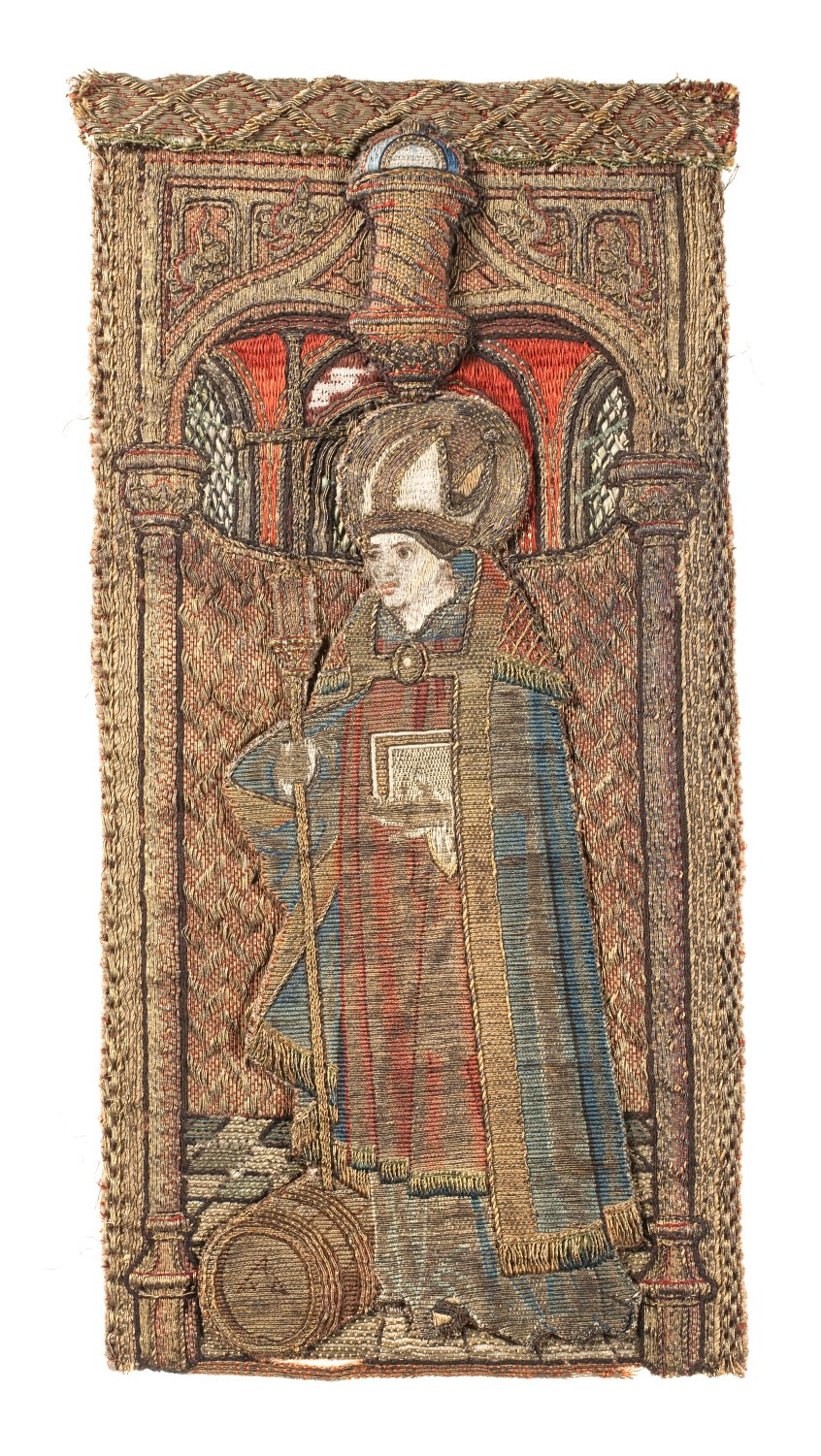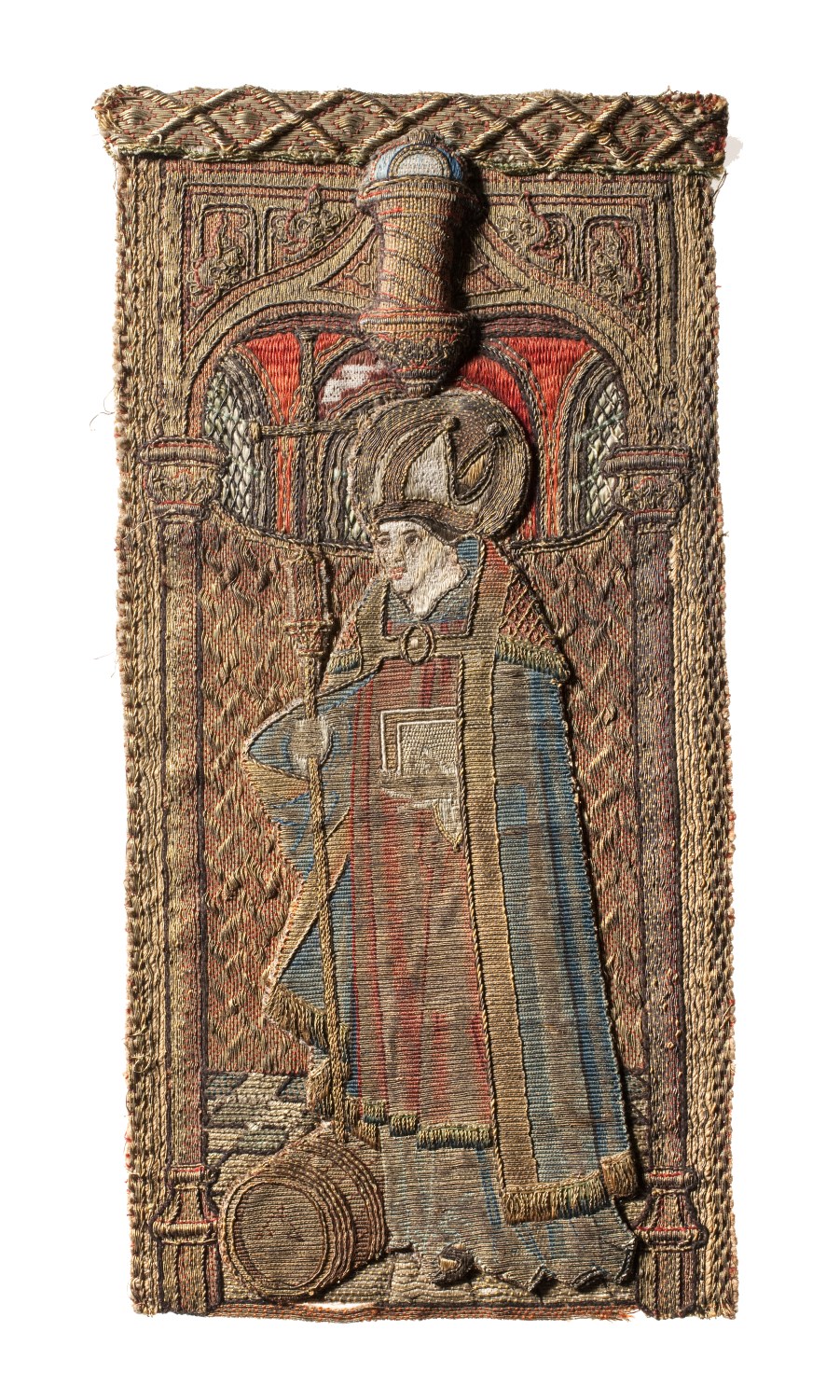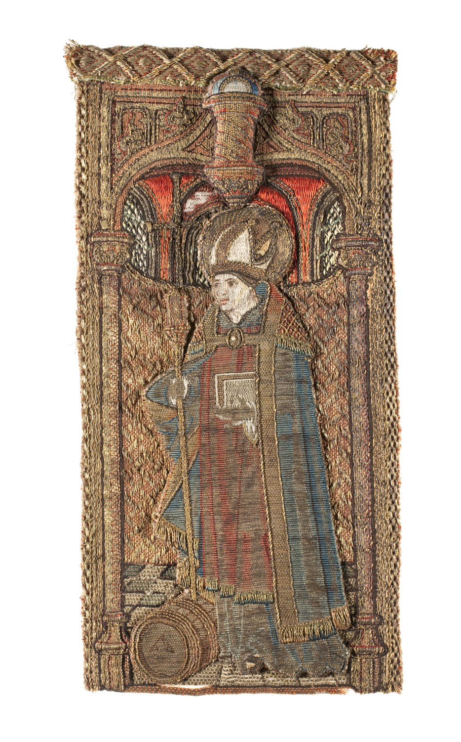 Op het borduurwerk wordt in eenzelfde architecturale ambiance als ABM t2107a staande op een tegelvloertje de eerste bisschop van Utrecht, Willibrordus, afgebeeld. Hij is gekleed in een albe, dalmatiek en koormantel, welke met een agrafe gesloten is. Het koorkapschild is met een gouden netwerk overtrokken. Op zijn hoofd draagt hij een mijter. In de linkerhand ...