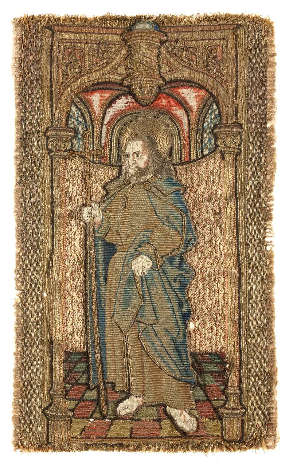 Op het borduurwerk wordt in eenzelfde architecturale ambiance als ABM t2107a staande op een tegelvloertje de apostel Philippus afgebeeld. Hij draagt een onderkleed, dat aan de hals gesloten is, een gordel en een mantel met kraag. Met de linkerhand houdt hij de mantel op, in de rechterhand houdt hij zijn attribuut, de kruisstaf. Techniek: zie ...