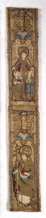 De geborduurde strook is, gezien de geringe breedte evenals ABM t2108b afkomstig van een dalmatiek en beeldt twee heiligen af. Ze staan op een tegelvloertje in een nis onder een baldakijn, dat aan de bovenkant de vorm heeft van een kasteelmuur met kantelen. De baldakijnen zijn versierd met eenvoudige voluten. Op het bovendeel wordt de ...