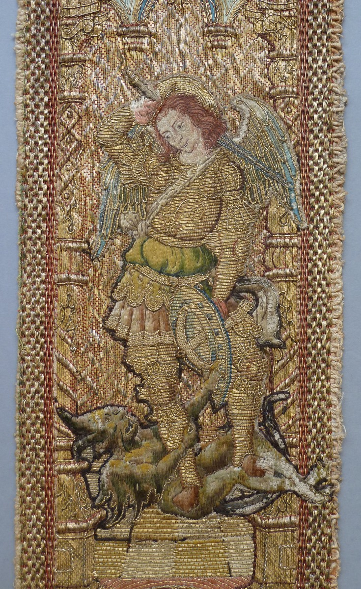 Aurifries van dalmatiek met H. Michael met satan en St. Margaretha met draak