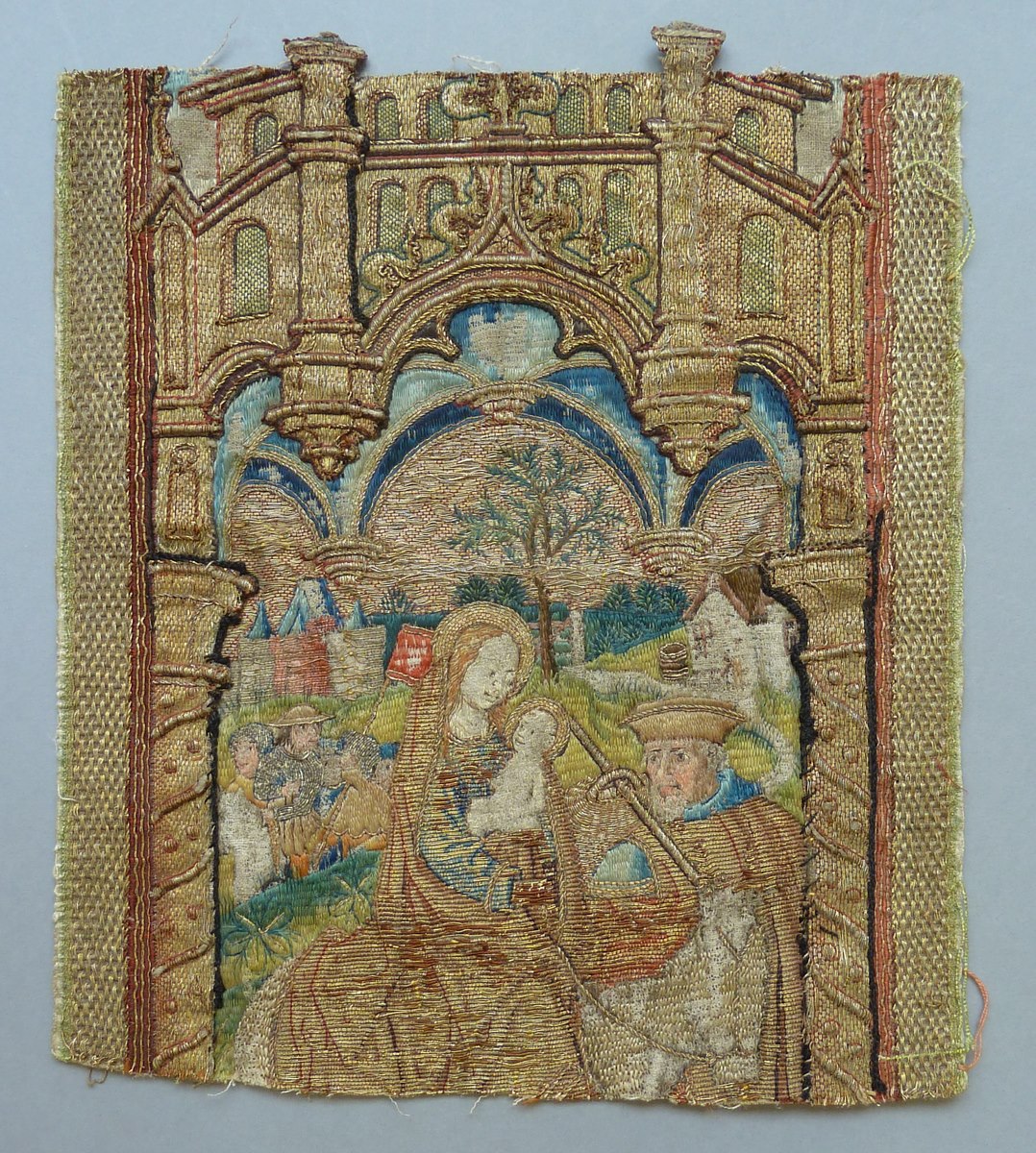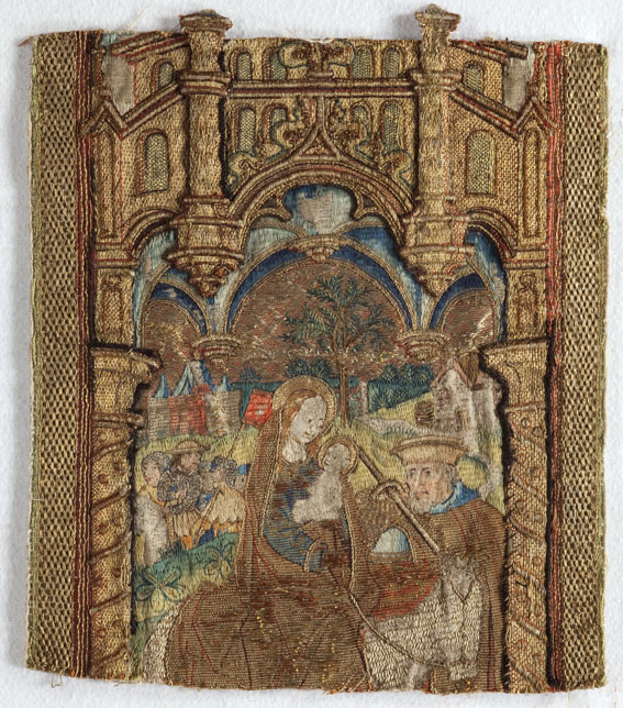 Op het versneden aurifries wordt de Vlucht naar Egypte voorgesteld. Maria zit op een door Jozef geleide ezel met het Christuskind onder haar mantel in de armen. Josef, met mantel en hoed, houdt over zijn schouder een staf, waaraan een mandje hangt. Het begroeide landschap met bomen op de achtergrond toont in de verte een ...