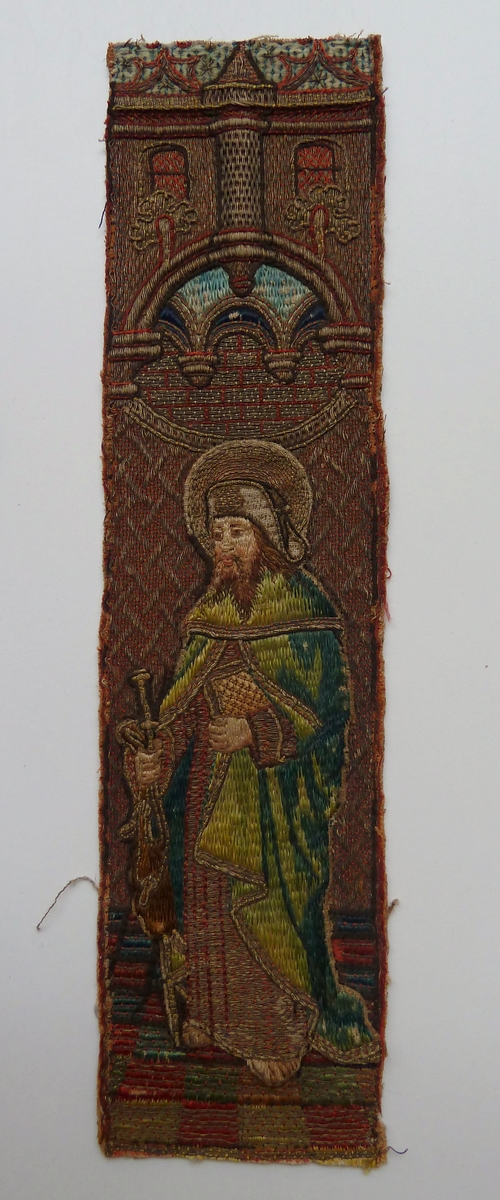 In eenzelfde architecturale ambiance als ABM t2121a wordt op het fragment de apostel Jacobus Maior afgebeeld. Hij is gekleed in onderkleed, mantel met cappa en pelgrimshoed. Op de hoed het schelpmotief, dat verwijst naar Santiago de Compostela. In de rechterhand houdt hij de pelgrimsstaf, in de linker een boek. Techniek: voor de architectuur zie ABM ...