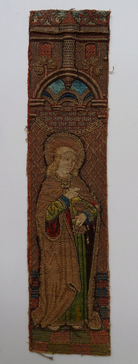 Op het borduurfragment wordt in eenzelfde architecturale ambiance als ABM t2121a de evangelist Johannes afgebeeld, staande op een tegelvloertje. Hij gaat gekleed in een onderkleed en mantel. In de linkerhand houdt hij zijn attribuut, een kelk. Techniek: voor de architectuur zie ABM t2121a. De mantel, het aureool, de kelk en de zoom van het kleed ...