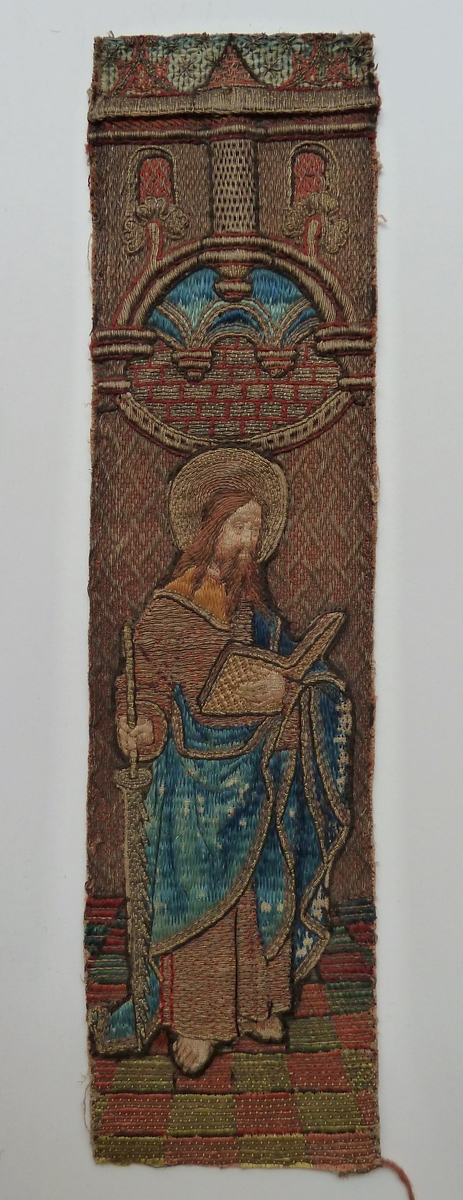In eenzelfde architecturale ambiance als ABM t2121a wordt op dit aurifriesfragment de apostel Simon afgebeeld, gekleed in een onderkleed met kraag en gezoomde mantel. In de linkerhand houdt hij een boek, in de rechter zijn attribuut, de zaag, die met de punt op de grond rust. Techniek: voor de architecturale elementen zie ABM t2121a. Het ...