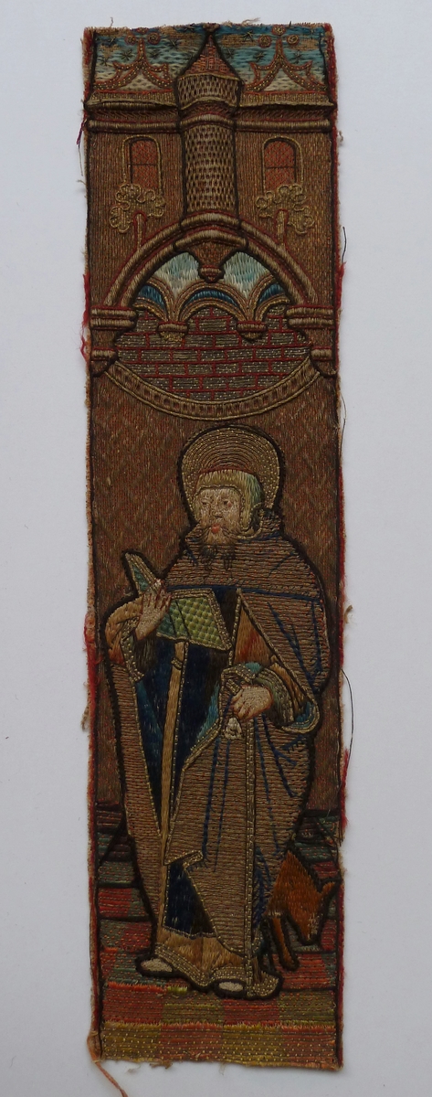 Op het aurifries wordt in eenzelfde architecturale ambiance als ABM t2121a staande op een tegelvloertje Antonius Abt uitgebeeld, gekleed in een onderkleed, scapulier en gevoerde mantel met kapje. In de rechterhand houdt hij een boek, in de linker de abtsstaf met bel. Achter hem loopt zijn attribuut, het varkentje. Techniek: het onderkleed, het scapulier, de ...
