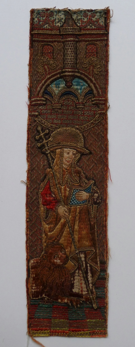 Op het aurifriesfragment wordt in eenzelfde architecturale ambiance als ABM t2121a staande op een tegelvloertje de H. Hieronymus uitgebeeld, gekleed als kardinaal met rode kardinaalshoed, rode mantel en onderkleed. In zijn linkerhand houdt hij een kruisstaf, rechts een opengeslagen boek. Links aan zijn voeten zijn attribuut, de leeuw. Techniek: aureool, staf en boek zijn van ...