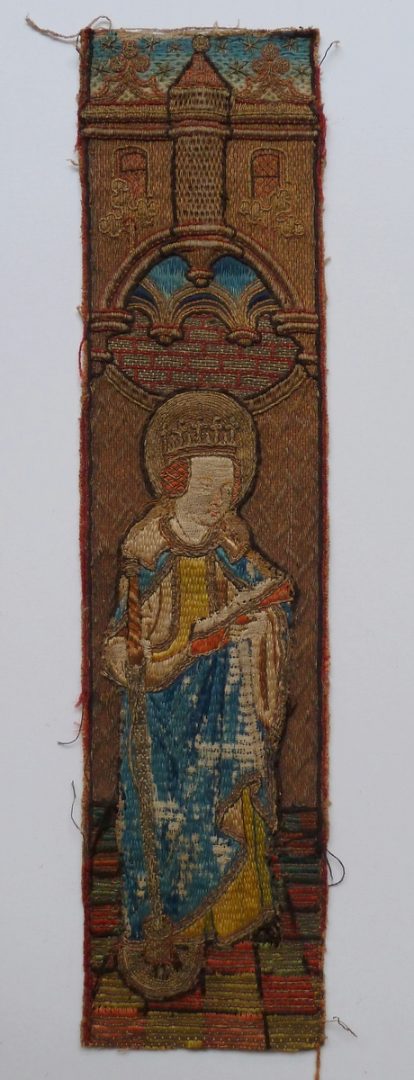 Het aurifriesfragment beeldt in eenzelfde architecturale ambiance als ABM t2121a staande op een tegelvloertje de H. Catharina van Alexandrië af. Ze gaat gekleed in een onderkleed en een mantel met kraag, die met gouddraad is afgebiesd. Aan haar voeten ligt haar attribuut, het rad, waarop het zwaard staat. In haar linkerhand een opengeslagen boek. Haar ...