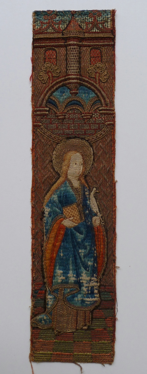 Op het aurifriesfragment wordt in eenzelfde architecturale ambiance als ABM t2121a staande op een tegelvloertje de H. Cecilia afgebeeld. Zij draagt een onderkleed en een mantel. In de rechterhand houdt ze een gesloten boek, op haar linkerhand haar attribuut, een valk. Techniek: zie voor de architectuur ABM t2121a. Het onderkleed en het boek zijn van ...