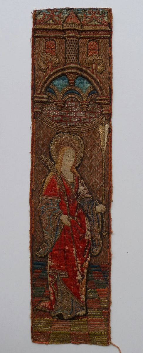 Op het aurifriesfragment wordt in eenzelfde architecturale ambiance als ABM t2121a staande op een tegelvloertje de H. Ursula afgebeeld. Zij is gekleed in een onderkleed en bovenkleed; de ondermouwen steken uit de bovenmouwen. Zij houdt een palmtak in de rechterhand en een pijl met de punt naar beneden in de linkerhand. Haar haren golven over ...