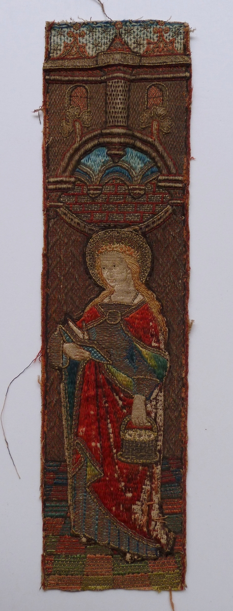Op het borduurwerk wordt in eenzelfde architecturale ambiance als ABM t2121a staande op een tegelvloertje de H. Dorothea afgebeeld. Zij gaat gekleed in een onderkleed en mantel. Haar haren golven over de schouders. Op het hoofd draagt zij een bloemenkrans. In de rechterhand houdt zij een boek, in de linker draagt zij een korfje met ...