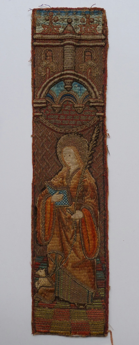 Op het aurifriesfragment wordt in eenzelfde architecturale ambiance als ABM t2121a staande op een tegelvloertje de H. Agnes afgebeeld. Zij gaat gekleed in een onderkleed en bovenkleed met zeer wijde mouwen en donkere voering. Zij houdt het lam met haar linkerhand, waarin ze ook een palmtak heeft, aan de lijn. In de rechterhand heeft ze ...