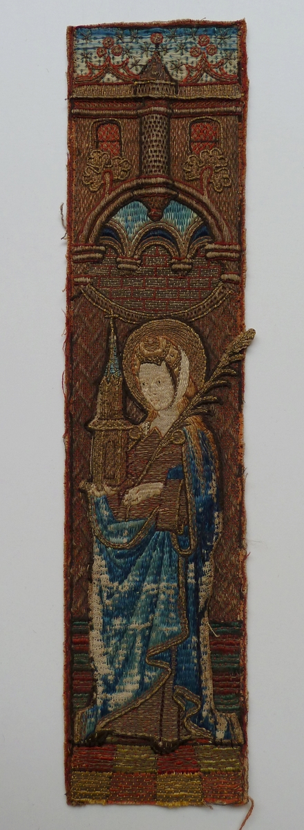 Het aurifriesfragment beeldt in eenzelfde architecturale ambiance als ABM t2121a staande op een tegelvloertje de H. Barbara af. Zij is gekleed in een onderkleed en mantel. Op het hoofd draagt ze een muts met witte band. Daaronder golft het haar over de schouders. In de rechterhand houdt zij haar attribuut, de toren, in de linkerhand ...