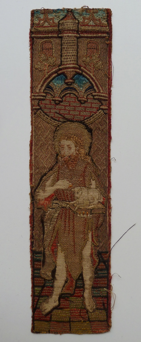 Op het aurifriesfragment wordt in eenzelfde architecturale ambiance als ABM t2121a staande op een tegelvloertje een gebaarde St. Johannes de Doper afgebeeld. Hij wordt afgebeeld als boeteprediker en draagt een in punten afhangend mouwloos kemelharen kleed, dat zijn benen vanaf de dij vrijlaat. In zijn linkerhand draagt hij een boek, waarop zijn attrubuut, het Lam ...