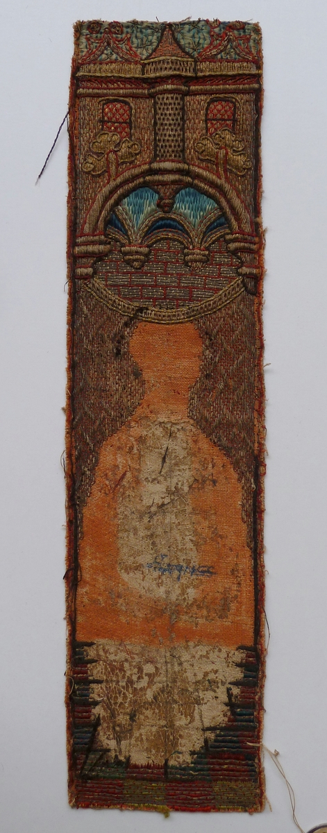 Op het aurifriesfragment wordt eenzelfde architecturale ambiance afgebeeld als ABM t2121a. De heilige, die daar oordpronkelijk op was aangebracht, ontbreekt. In de daarvoor uitgespaarde ruimte zijn delen van de ondertekening zichtbaar. Techniek: zie ABM t2121a.